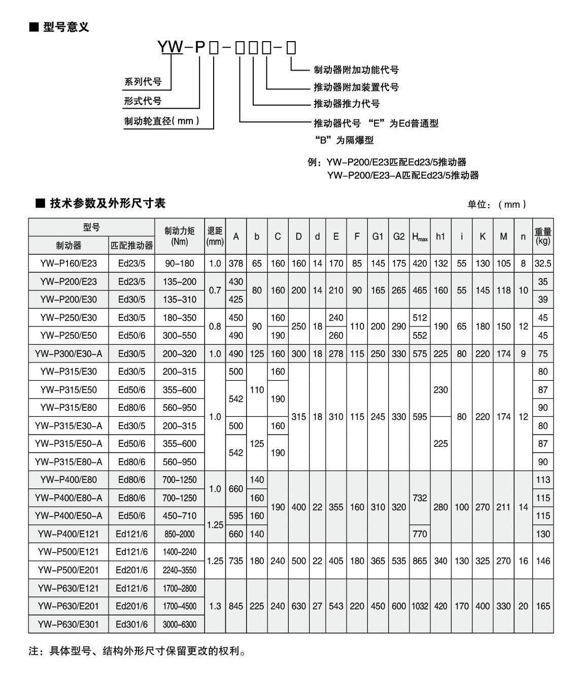 應(yīng)用:YWZ8,YWP系列電力液壓鼓式制動器,廣泛應(yīng)用于有防爆要求的各種起重運輸、皮帶運輸、港口裝卸、冶金及建筑機(jī)械中各種機(jī)構(gòu)的減速和停車(維持)制動。符合標(biāo)準(zhǔn):YWZ8.YWP系列電力液壓鼓式制動器的連接尺寸和制動力矩參數(shù)符合JB/ZQ4388-86和GB6333-86(帶A系列)標(biāo)準(zhǔn),技術(shù)要求符合JB / T6406-2006標(biāo)準(zhǔn),配套符合DIN15430標(biāo)準(zhǔn)的Ed系列推動器。主要特點:▲ 聯(lián)鎖式退距均等裝置和瓦塊自動隨位裝置,可始終保持兩側(cè)瓦塊退距均等且無需調(diào)整,完全避免因退距不均使一側(cè)制動襯墊浮貼制動輪的現(xiàn)象;▲ 主要擺動鉸點均設(shè)有自潤滑軸承,傳動效率高,壽命長,使用中無需潤滑;▲ 制動彈簧在方管內(nèi)布置并設(shè)有標(biāo)尺,用戶可十分方便地讀出制動力矩值,免去測量和計算的麻煩;▲ 制動襯墊為(帶卡槽)卡裝式整體成型結(jié)構(gòu),更換十分方便、快捷,備有半金屬(無石棉)硬質(zhì)和半硬質(zhì),軟質(zhì)(無石棉)等不同材質(zhì)的制動襯墊供用戶選擇;▲ 配套Ed系列電力液壓推動器產(chǎn)品,動作靈敏、使用壽命長;▲ 常閉式設(shè)計,(斷電)彈簧制動,(通電)推動器釋放。工作條件:◆ 海拔高度:<2000m;◆ 環(huán)境溫度:-20°C?+ 40°C;◆ 相對濕度:≤90%;◆ 工作制:間歇性(S3-60%)和連續(xù)(S1);◆ 電源電壓:三相交流,AC380 50Hz (其他電源等級可按需要定制);◆ 有特殊要求時在訂貨時協(xié)商確定?;緟?shù):● 產(chǎn)品型號:YWZ8-200、YWZ8-250、YWZ8-300、YWZ8-315、YWZ8-400、YWZ8-500、YWZ8-600、YWZ8-630、YWZ8-700、YWZ8-710、YWZ8-800● 適用輪徑:200~800mm● 制動力矩:135~10000Nm基本參數(shù):● 產(chǎn)品型號:YWP-200、YWP-250、YWP-315、YWP-400、YWP-500、YWP-630、YWP-710、YWP-800● 適用輪徑:200~800mm● 制動力矩:80~12500Nm